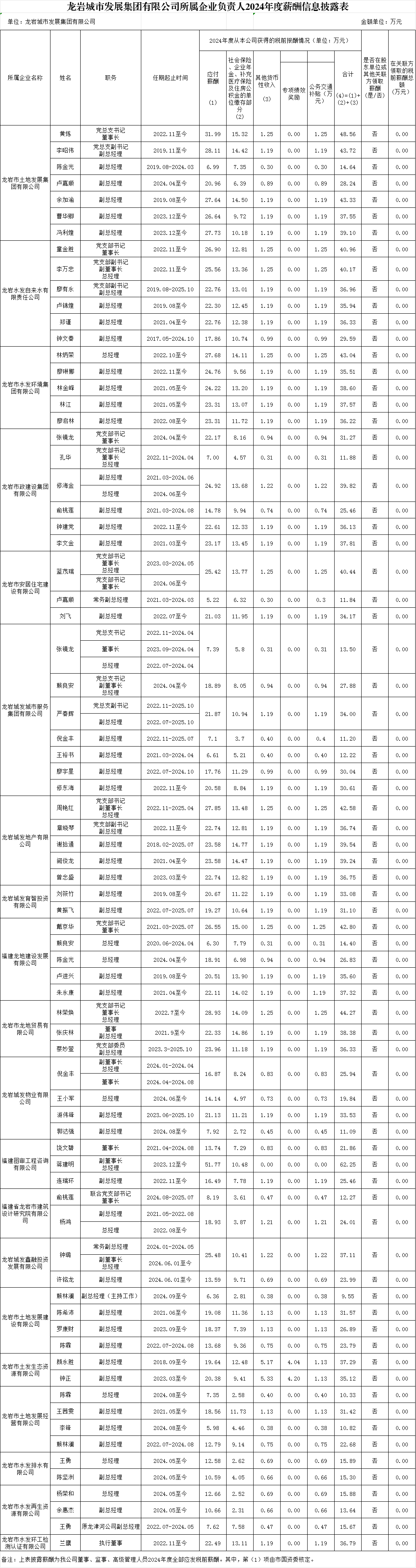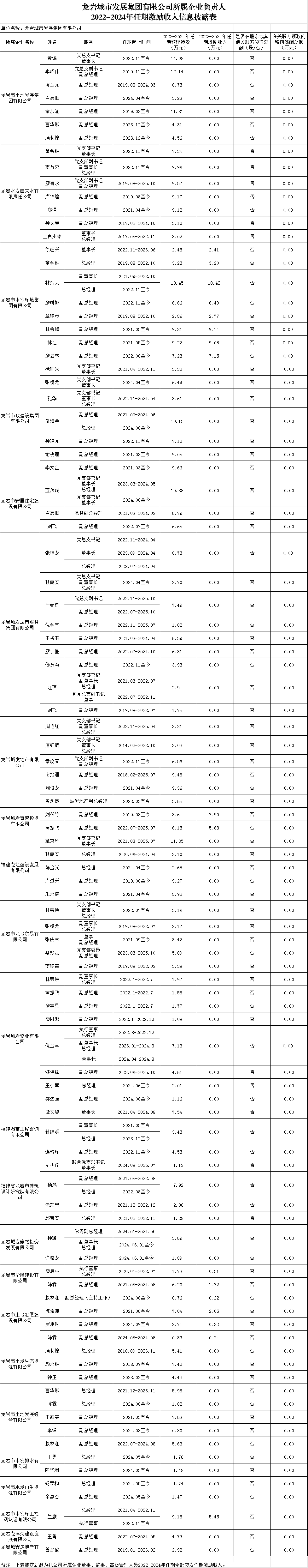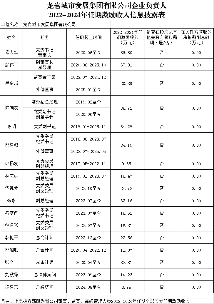 龍巖城市發(fā)展集團(tuán)有限公司及所屬企業(yè)負(fù)責(zé)人2024年度薪酬、2022-2024年任期激勵(lì)收入信息披露表